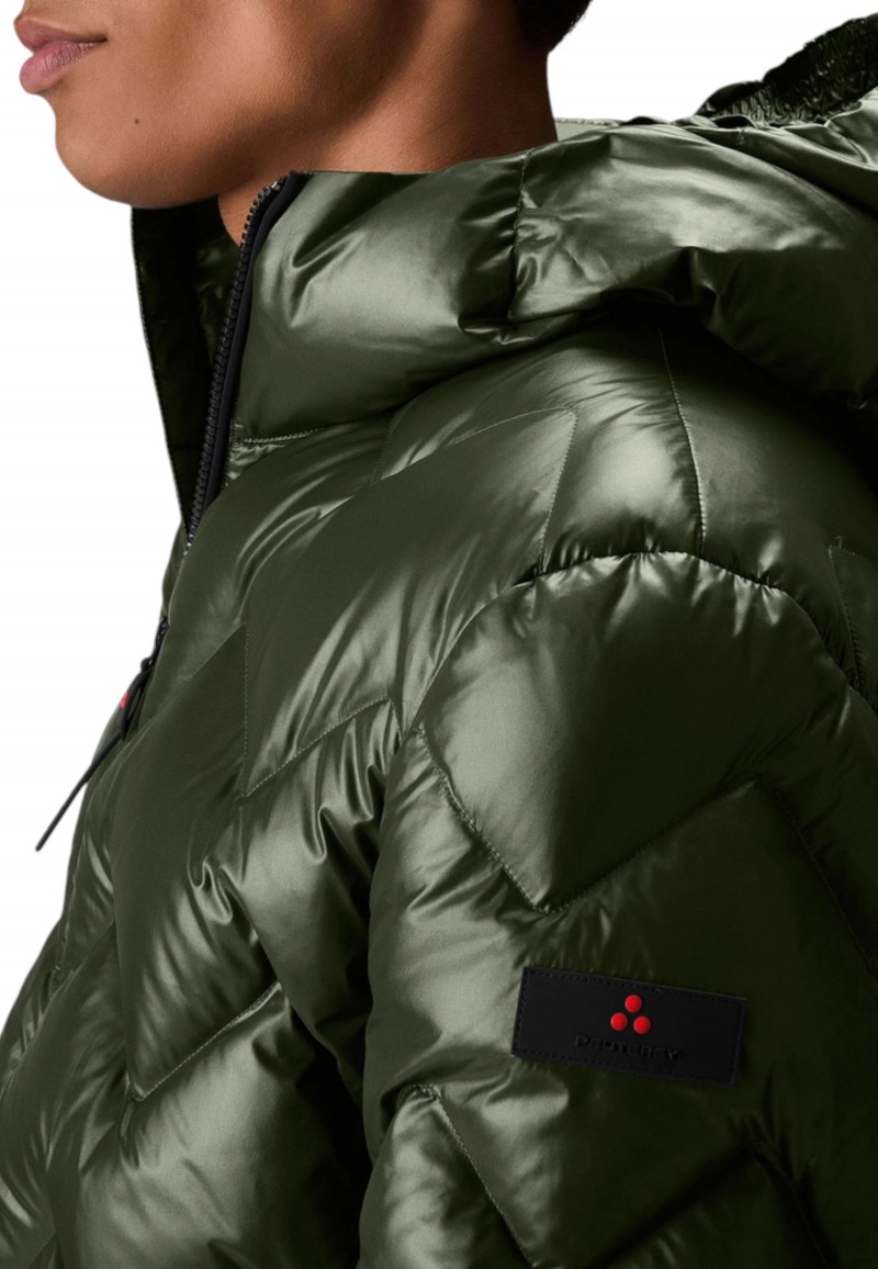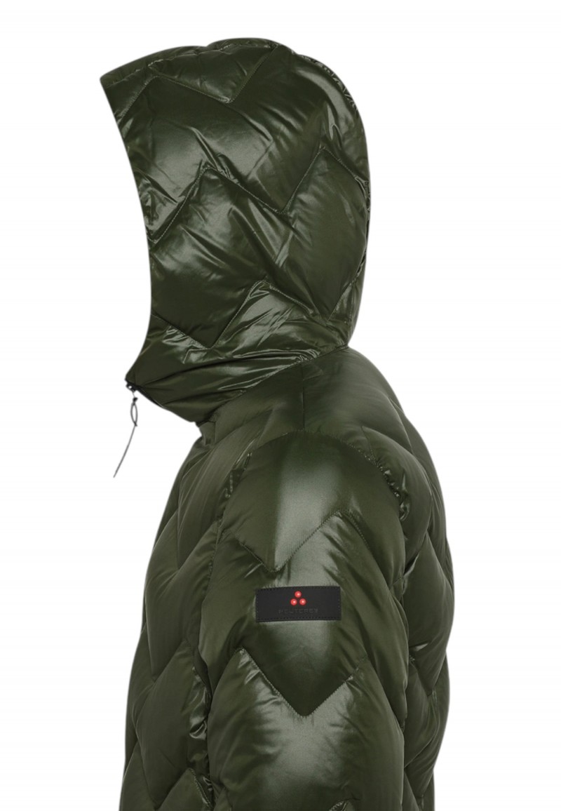 - Lunghezza: corto Cappuccio fisso regolabile In nylon super leggero e lucido Zip a doppio cursore Dettagli neri Trapunta Chevron Imbottitura in piuma naturale certificata Idrorepellente e antivento